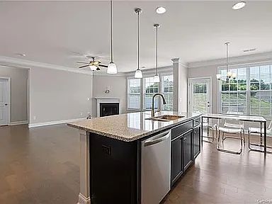 You'll love the open floor plan featuring hardwood floors throughout the main level, elegant wainscoting and crown molding, and granite countertops in the kitchen and all baths. The formal dining room has been thoughtfully converted into a home office, perfect for remote work or study.