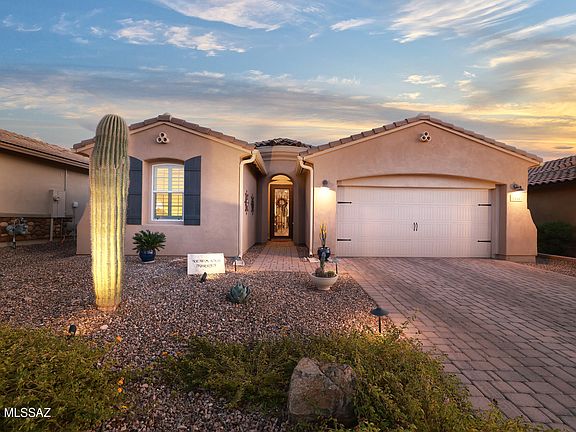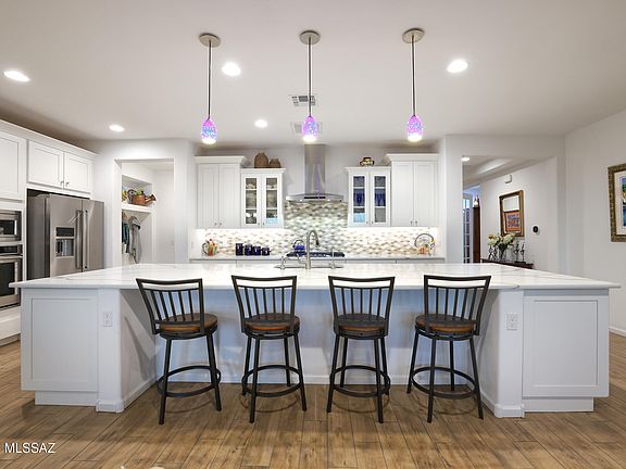 Perfectly positioned against the open desert of the Tortolita Preserve, this beautifully appointed Dove Mountain residence blends modern sophistication with timeless comfort. Every detail--from the elegant fireplace to the stunning quartz finishes--has been carefully selected for effortless living.The open-concept layout is filled with natural light, anchored by a warm great room with a striking stacked-stone, floor-to-ceiling fireplace, and enhanced by porcelain tile flooring that flows seamlessly through every room. A 16-foot, four-panel sliding glass door opens to the patio, blending indoor and outdoor living while showcasing the beautiful desert and mountain views beyond. The chef's kitchen combines beauty and function with glass-front, upgraded cabinetry, soft-close doors and drawers, KitchenAid stainless steel appliances, and a massive extended island with dramatic quartz countertops featuring bold, flowing veining. The island includes additional cabinetry on both ends for exceptional storage and workspace, while elegant blue glass pendant lights add a designer touch that complements the home's refined style.