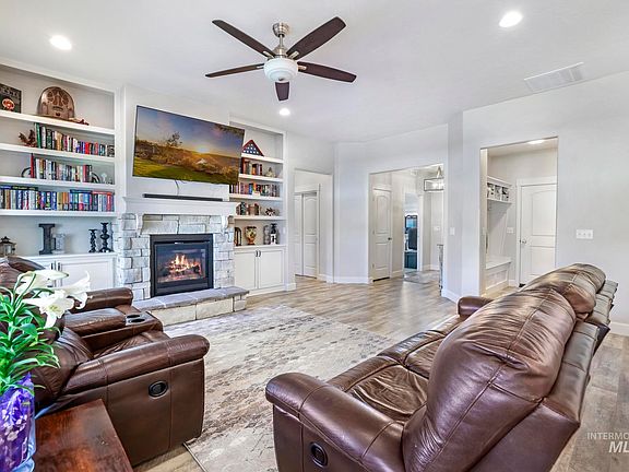 This thoughtfully custom built 4-bedroom home is infused with beauty, warm and welcoming from the rock fireplace surrounded by floor to ceiling shelving. In the heart of the home we have upgraded cabinetry that reaches the ceiling, gorgeous quartz countertops, and add to it the well designed walk-in pantry, and the kitchen is stacked to be the hub of your home. It's where everyone will gather, creating memories that last. After a long day, come home to soak in 1 of the 2 XL deep tubs to unwind and relax. The spacious primary suite offers a peaceful retreat with a large walk-in shower and oversized closet. Or recharge on your oversized covered patio, surrounded by a fully fenced and beautifully landscaped yard. Solar panels add efficiency as well as modern ease, the power bill is $0! An extended garage gives you space for storage. This home blends convenience with a sense of community. It’s ready to welcome you home!