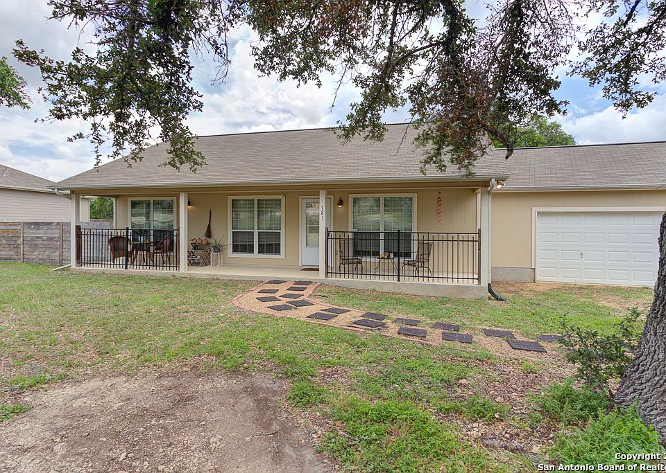 Here is a well maintained 3BR/2Bath home in Rancho del Lago. Home sits level half acre lot. Covered porches front and back, Oversize garage, fenced yard with outbuilding and chicken coop. Open floorplan with split bedrooms, breakfast bar, granite countertops and stainless appliances. All wood-look Vinyl flooring. Comal ISD, No city taxes.