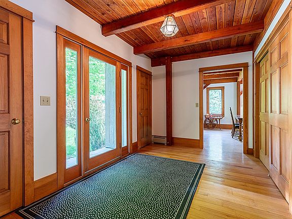 Beautifully constructed Davis Timber frame home in the desirable Silver Hill region of West Windsor. Spacious, bright rooms connect beautifully to private outdoor deck and screened porch overlooking a large swimming pond. The generous living room runs front to back anchored by a beautiful stone fireplace with warm golden hardwood floors, and exposed beam structure. The open concept kitchen offers plenty of workspace, and benefits from a closet pantry, and there are several options for dining space. There's a main level office/study which would easily accommodate a primary bedroom option. On the second level, there is a spacious primary bedroom suite, and two additional bedrooms sharing a bathroom. Loft space above for additional accommodation. The lower level is walkout finished space with a huge family room featuring a brick cove with potential to accommodate a woodstove. The oversized two-car garage has a drop staircase (with plenty of storage above) and steps directly into the mudroom. Located on a quiet dirt road, but just 1 mile from pavement with nearby recreational trails in every direction. 5 min to Mt Ascutney, Butcher Pantry. 30 min to Okemo. 20 min to Woodstock