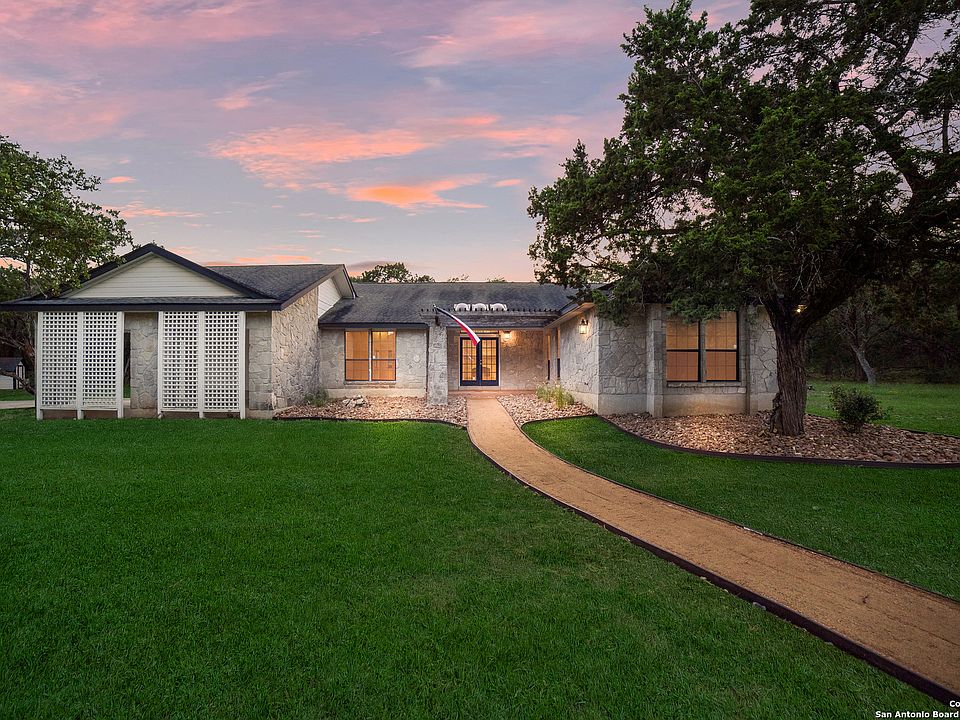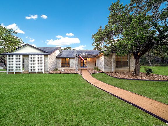 Nestled on a sprawling 10.28-acre lot, this incredibly private and tranquil property offers a serene retreat away from the hustle and bustle of city life. With no visible roads or neighboring homes, it provides a secluded haven where you can truly unwind. Imagine savoring your morning coffee or a glass of wine on the porch, delighting in the sight of abundant wildlife. The property boasts numerous amenities, including a horse stall or additional storage space, a half-mile trail loop encircling the grounds, and multiple trails perfect for leisurely walks, invigorating jogs, horseback riding, or ATV adventures. Nature enthusiasts will revel in the rich wildlife, with frequent sightings of whitetail and axis deer, rabbits, turkeys, and various bird species. Conveniently located near San Antonio, New Braunfels, Canyon Lake, and the scenic wonders of the Guadalupe and Comal Rivers, this property allows easy access to the vibrant Texas Hill Country. The area offers exceptional private and public schools within the Comal Independent School District. The residence itself has been thoughtfully updated, featuring a modern kitchen with a farmhouse sink and countertops, a spacious mudroom, renovated bathrooms, new floors, fresh paint, upgraded HVAC and water heaters, and even a dog run for furry family members. With 4 bedrooms, 2.5 bathrooms and 2,536 square feet of living space, this home offers flexibility, with rooms suitable for use as a home office or a playroom. Finally, a stunning stone fireplace serves as a focal point, capable of running off either firewood or propane.
