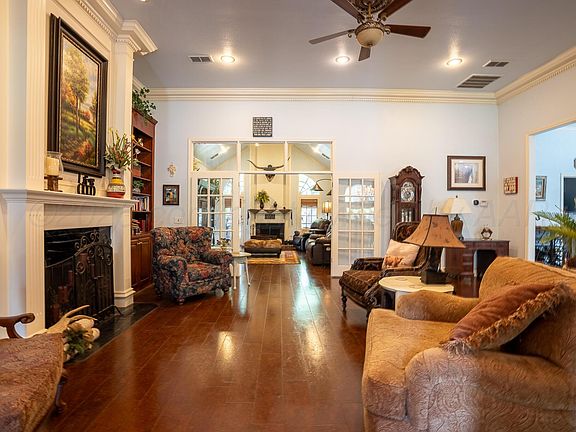 Welcome to your Sleepy Hollow custom-built retreat offering FOUR bedrooms, TWO living areas & timeless character throughout. The remodeled kitchen shines w/new custom cabinetry, granite countertops, gas cooktop, double ovens & extended breakfast bar. Relax in the isolated owner's suite w/patio access, dual closets & ensuite featuring soaking tub & separate shower. An INDOOR SAFE ROOM adds peace of mind, while a large walk-up attic offers endless possibilities; ideal for a hobby/game room or 5th bedroom conversion. Outdoors, unwind beneath mature shade trees surrounded by lush greenery, soothing fountain, 2 covered patios, dog run w/turf & greenhouse; the perfect backdrop for entertaining or peaceful evenings. With a Class 4 metal roof, this home blends comfort, security & timeless style.
