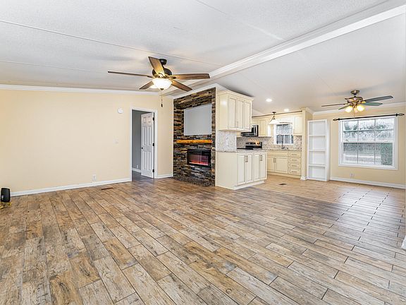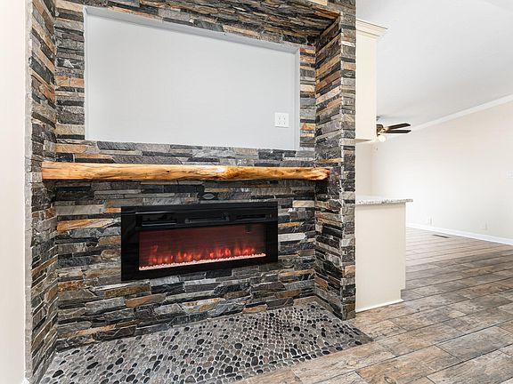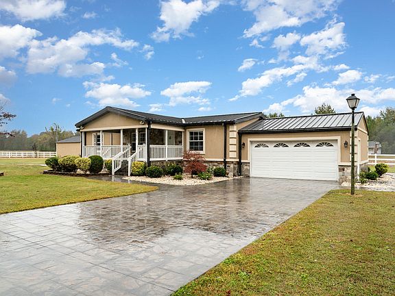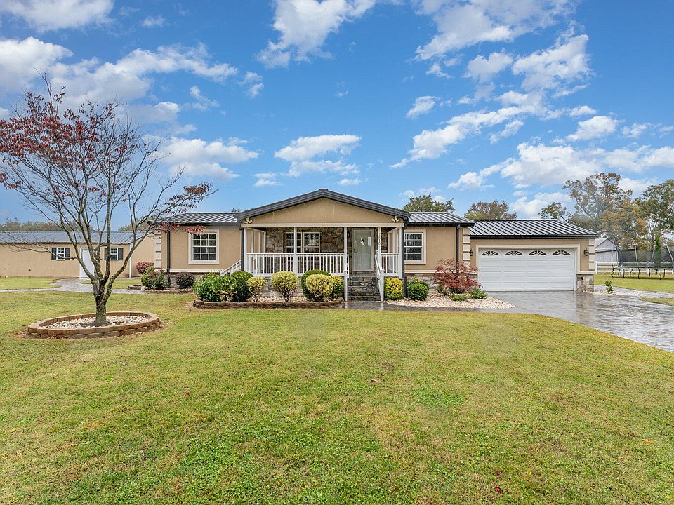 This beautifully remodeled home sits on over an acre of land, offering the perfect blend of comfort, functionality, and curb appeal. Featuring 3 bedrooms, 2 bathrooms, and a detached workspace ideal for a home office, gym, or studio. This property is designed for both relaxation and productivity. Step outside to enjoy the stunningly enhanced landscape, featuring a circular stone driveway with a striking centerpiece, manicured shrubs, cypress trees, and a custom stone wall design that adds elegance and character to the property. Inside, you'll find a bright and open layout with stylish finishes, a cozy stone-accented fireplace, and a modern kitchen with plenty of cabinet space. The home also features a metal roof for durability and a covered front porch perfect for enjoying peaceful country evenings.