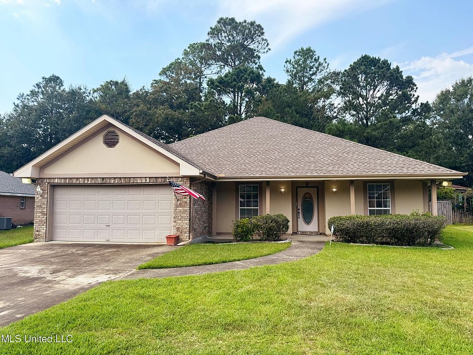 Terrific home in the heart of Diamondhead. Entry foyer. Formal dining room or office. Spacious eat in kitchen with breakfast bar and pass through to the great room. Refrigerator remains. Large great room with extra high ceiling and fireplace. Split floor plan. Large main bedroom suite with walk in closet, double sinks, tub and separate shower. Large guest bedrooms both have walk in closets. Utility room with washer and dryer remaining. Covered back patio. Fenced in yard.