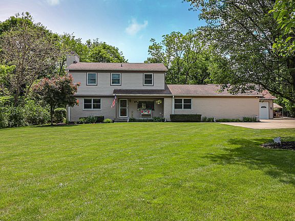 Beautiful home nestled on a private 1-acre wooded lot north of Fort Harrison State Park & south of Geist. Boasting 4850 sq ft, 4 beds, 2.5 baths, w/ updates throughout, including; bamboo hardwood flrs, granite countertops, SS appliances, butler's pantry, b-fast area, sunroom, w/ a main level bedroom & spacious laundry rm. The primary suite offers updated bathroom w/ tiled shower, fireplace, sunroom w/ balcony. The finished walkout basement features a rec/play area, workshop/storage, & wine cellar. The large detached 4-car garage is finished, heated, w/ car lift, oversized doors, & upstairs office/loft. A true multipurpose outbuilding. Back deck is perfect for leisure & entertaining w/ covered bar/dining area, fire pit, and tons of privacy!