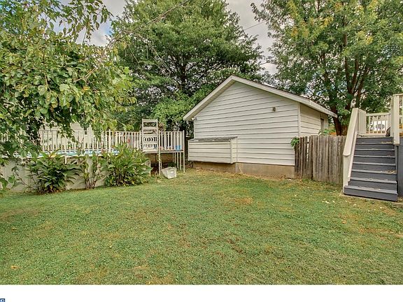 Large Cape Colonial with finished front Porch on corner property in Fox Chase Features Huge Living Room/ Great room with window box seat,knotty pine walls and wall to wall carpet over hardwood floors. Great Room opens to Kitchen w/separate eating room. Solid Stained Maple cabinetry, Stainless Steel appliances, Gas range, overhead Microwave, ceramic tile floor. Kitchen opens to large deck with views of corner yard, detached garage and above ground pool. From the Great Rm/LR is double glass French doors that open into the hallway with custom built-in shelving and 3 roomy bedrooms, Master bedroom and 2nd and 3rd bedroom. Newly renovated Hall bath w/corner tub & Neo Angle shower and ceramic tile floor. 2nd floor offers large bedroom and newly renovated 2nd bathroom. Full unfinished basement.