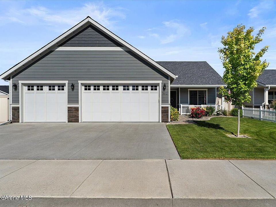 Located in the desirable community of Garden Grove, CDA is this beautiful 4 bdrm 2 bath, 3 car garage home. This single level home has a large open floor plan making entertainment perfect for any gathering with friends and family. The kitchen has quartz countertops and a very large island with stainless steel appliances including gas range, microwave hood and dishwasher plus an extra large pantry for ample storage. A short step to the living room is a charming gas fireplace making it warm and cozy. There are plenty more upgrades to this gorgeous home including pendant lights, backsplash, custom fireplace mantle, laminate flooring throughout the main living area, a covered front porch, and 90% efficient gas forced air furnace and a special feature called Trimlight Edge, an exterior lighting system providing outdoor lighting decor whenever you want. The large primary suite features a luxurious bathroom and huge walk-in closet and linen closet. Step out to either of two sliding glass doors to your low maintenance outdoor terrace perfect for conversation or enjoying a good book. The yard is adorned with flowers and raised garden beds, all with an installed drip system and sprinklers to make gardening a breeze. The 4th bedroom can be used as a bedroom or an office. The mud room has plenty of room for storage and a full-size washer and dryer. The 3-car garage has custom built in shelving and rubberized custom flooring. The Garden Grove community is loaded with walking paths, community garden beds, greenspace and trees. Is close to shopping and downtown.