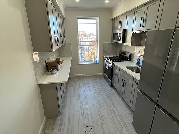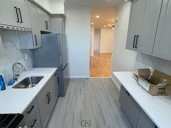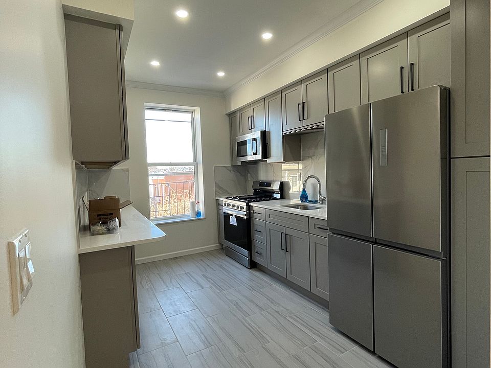 **Inquire for Video & Virtual Tour** Ascend to the epitome of modern living with this exquisite top-floor, two flights up, brand-new apartment that has undergone a meticulous gut renovation. Revel in the luxury of 2.5 bedrooms, each basking in an abundance of natural light, creating a bright and airy ambiance. The large common area seamlessly blends a spacious living room, adorned with a contemporary ceiling fan for comfort, and an elegant dining room featuring a chandelier, setting the stage for stylish and comfortable gatherings. Two generously sized king bedrooms provide ample space, and an additional home study offers versatility to adapt to your lifestyle. The heart of this home is its spacious kitchen, fully equipped with state-of-the-art stainless steel appliances, including a convenient microwave. The kitchen cabinetry sleek design with quartz countertops and wine glass holder above sink for an added touch. Crown moldings and real hardwood floors grace every corner, adding a touch of sophistication and warmth to the entire space. Pamper yourself in the beautiful bathroom, complete with a new vanity and an additional bonus cabinet, complementing the mirrored medicine cabinet for extra storage and functionality. This prime location is a mere 1.5 blocks away from the R train subway, ensuring seamless transportation, while a bus stop conveniently awaits across the street. Beyond the doorstep, discover the convenience of supermarkets and a plethora of dining options just blocks away. Indulge in the perfect blend of style, comfort, and convenience within this thoughtfully designed and beautifully appointed residence. Make this your sanctuary in the heart of the city. Heat & Hot Water Included No Pet Policy Available Now Message us for a video tour, schedule a viewing or for an application.