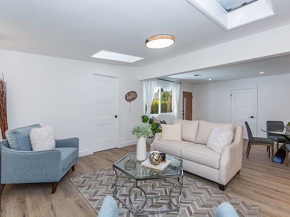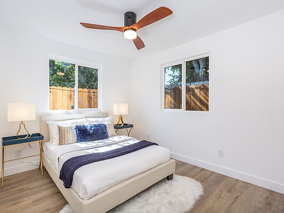 Ideally situated on a beautiful neighborhood street along the foothills of Sunland is a modern single-story home. As you enter this 2 bedroom, 2 bath home be greeted by an airy floor-plan with a delightful living room featuring a cozy fireplace that soothes the senses. Throughout the home, enjoy tasteful new waterproof vinyl flooring and recessed lighting. The home offers large skylights that boasts an abundance of natural light. The guest bathroom off the living room includes a modern spa like walk-in shower. The designer open kitchen concept will make preparing every meal memorable with upgraded stainless steel appliances and an open view to the living/dining areas. The primary bedroom features an upgraded en-suite bathroom with a double vanity for all your morning prep. The long driveway in the front of the home provides secure and ample parking for all of your vehicles. The large front yard with lush landscaping is perfect for the year round California lifestyle and dining al-fresco. Additionally, solar panels and a new irrigation system help make this an energy efficient home