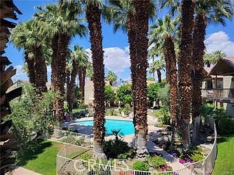 A real deal In Indian Wells! An upstairs private oasis in the Palm treetops of Indian Wells. Great location with stunning views of the surrounding mountains and the pool. This is a RARE condo with a FULL KITCHEN ready for entertainment. Samsung three door French refrigerator with an inside water pitcher double the size. There is a newer dishwasher a Samsung range with 4 burners plus one warmer. There is a convection oven and air fryer and more. There is a black stainless steel range hood and a newer water heater. There is a washer/dryer combo. The appliances are all updated and newer models. The backsplashes in the kitchen and bathroom were replaced in 2023 and all of the stone countertops were refreshed. There is an office off the kitchen for of your tech needs and a great feature for those who work from home. You can walk to the Cliff house restaurant across the street along with Vons grocery store, Starbucks and more retail stores all within walking distance. There is a guarded gate for security and an electric car charging station on site. Vaulted ceilings, open and spacious. The perfect retreat and or rental property. Mountain Cove is one of the most sought-after locations with all the amenities that you could ask for. Stone tile flooring inside and out as the open floorplan just over flows to the exterior balcony that is fully covered. Enjoy the cool breeze at night and you can star gaze on a clear night. Nestled in-between the golf course and the mountain this is the perfect place to call home.