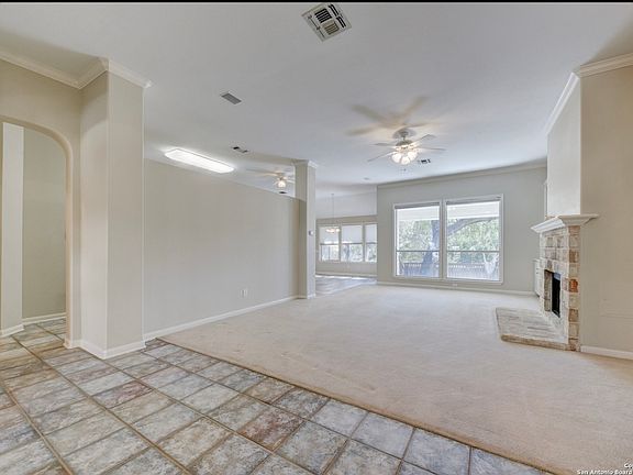 Bright, open layout with big windows allowing natural light to fill living spaces. The spacious living area features custom built-ins, a brick fireplace, and space for a large TV.