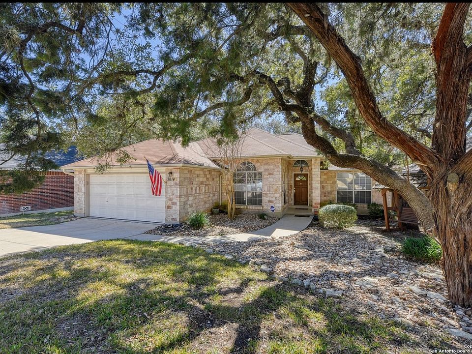 Beautiful curb appeal with accent brick, arched windows, and a multi-peaked roofline. Mature landscaping creates a peaceful, park-like setting.