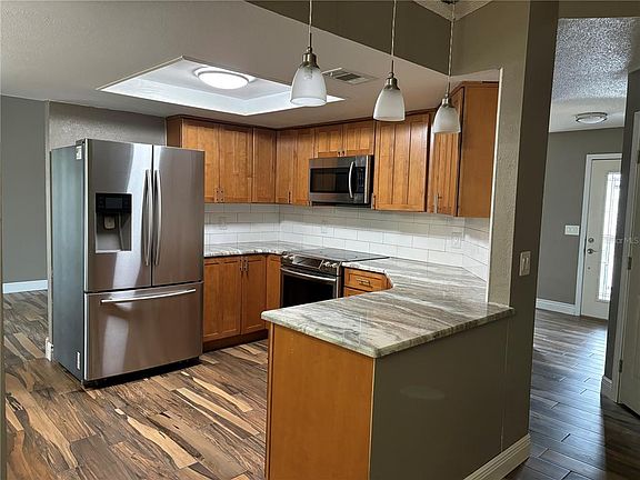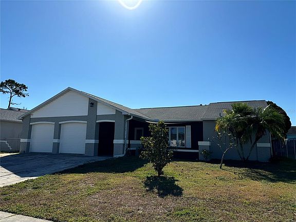 STUNNING 3 bedroom 2 bath home in REGENCY PARK! This EXTREMELY well cared for SPLIT FLOOR PLAN home offers an Updated kitchen FEATURING stainless steel appliances, GRANITE countertops, CUSTOM cabinetry and a FARMERS style sink! UPDATED bathrooms, Inside laundry room, tile flooring throughout, Large PRIMARY bedroom with en suite and two seperate closet's including a WALK IN! CATHEDRAL CEILINGS, two seperate LIVING/FAMILY ROOM areas, 2 car DOUBLE DOOR garage with NEW doors, NEW duct work, ceiling fans THROUGHOUT, front outdoor COURTYARD area, also a Fenced backyard including a SCREENED in porch area.. This one is a MUST SEE! This property is also very close to public transit, shopping, restaurants, medical, parks, beaches and just a short drive to the SUNCOAST PARKWAY.. Schedule your appointment today..