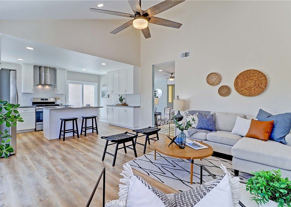Enter this beautifully appointed home, where luxury meets coastal living at an affordable price. Nestled within this private community, this 4-bedroom, 3-bathroom ~2,100 square feet gem is a rare find. With its premier location & the largest floor plan in Huntington Village Estates, it presents an exceptional opportunity to own a piece of paradise. Convenience & comfort merge effortlessly as the main floor offers a bedroom w/ a Newly upgraded full bath. As you enter, you will be captivated by the abundance of natural light that fills the open floor plan. Skylights strategically place, long windows on the staircase landing & vaulted ceilings, illuminate the space & create an inviting ambiance. The Newly upgraded kitchen is a chef's haven, featuring New stainless steel appliances, Quarts countertops, & an island that provides ample space for entertaining guests with ease. The kitchen seamlessly flows into an ideal area w/ cathedral ceilings, perfect for hosting gatherings or enjoying quiet moments by the fireplace. Open the glass doors on the main floor to discover an enclosed, private backyard oasis. This tranquil space features a delightful blend of hardscape & lawn, perfect for enjoying the indoor-outdoor lifestyle & savoring al fresco dining. Bask in the coastal breeze & relish in the beauty of the lush garden. Ascend to the second floor to find 2 additional spacious bedrooms & another Newly upgraded full bathrm, providing ample room for family or guests. The primary bedroom suite is a sanctuary of relaxation with vaulted ceilings, a ceiling fan, expansive walk-in closet, & lavish en-suite bathrm boasting a walk-in shower, separate tub, generous counter space, offering the ultimate retreat. Positioned next to the greenbelt, this home offers a serene setting w/ a sense of privacy while enjoying the peaceful tranquil backdrop atmosphere. Additional features of this home include ceiling fans, an indoor laundry room, leading to the spacious 2 car-garage, where storage space abounds & a 2 car driveway. As a residence, you'll have access to resort-style amenities: swimming pool, tennis courts, clubhouse & greenbelts. Situated just a short distance from the world-class beach, the iconic HB Pier, a large park, the vibrant locations of Five Points Center & Pacific City, this community offers the epitome of coastal living. Welcome home to this exceptional property, where Living Lux with Comfort, & the allure of coastal living intertwine seamlessly.