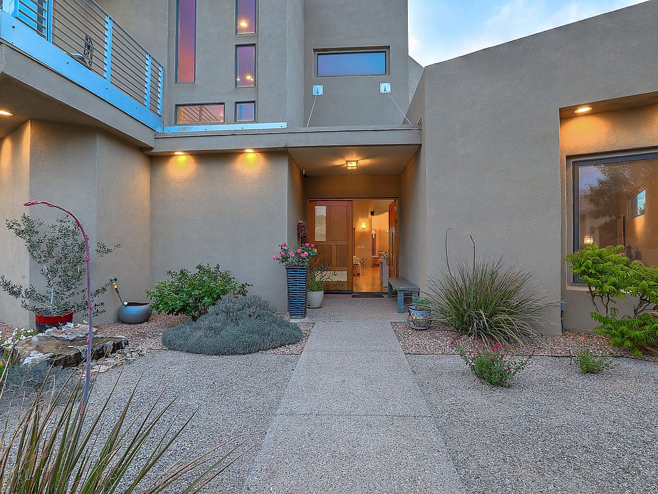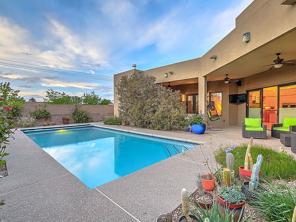 Introducing an exquisite residence located in North Albuquerque acres. High ceilings welcome you into the vast living room with open concept living. Thermador gas cooktop, dbl ovens, 2 dishwashers, modern wood cabinetry plus a large pantry complete the kitchen. The primary suite has a beautiful mountain view, laundry in the closet, walk in shower, and dbl vanities. Additionally downstairs is an office with access to the backyard plus a guest bedroom and bathroom. Upstairs enjoy the balcony with mountain views plus the loft space. Two bedrooms are adjoined with a shared bathroom and an another bedroom with en-suite bath. Open the glass sliding doors and bring the outdoors in. Enjoy the views from the backyard and cool off in the pool from the Albuquerque heat. North Star/La Cueva schools.