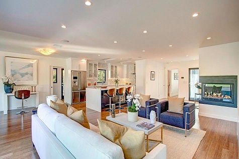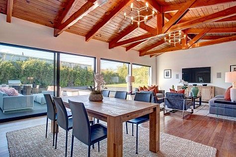 Situated on a 10,500 square feet lot, this stunningly remodeled Kentwood home encompasses the very essence of modern California living. With a contemporary take on a mid-century design, floor-to-ceiling windows effortlessly erase the boundaries between indoor and outdoor living. Indoors, the open concept kitchen boasts quartz counters and stainless Electrolux ICON appliances, and the vaulted wood beam ceiling in the great room is ideal for indoor entertaining. The master suite has expansive views to the lush yard and a luxurious spa-like bath with steam shower. Outside, the modern hardscape features a full outdoor kitchen, fire place, and a spectacular salt-water pool with built-in hot tub and custom water features, and the extra large lawn is readied for a game of summer croquet. Solar panels, custom automated window coverings, skylights and state-of-the-art, Control4 home automation make this smart home an intelligent purchase.