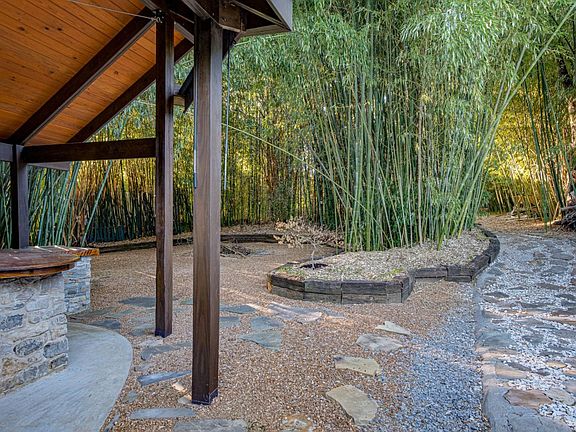 Sacred spacesDetached garageBamboo grovesCrescent moon fire pitRed mapleFenced back backyardFrench inspired stone cottage