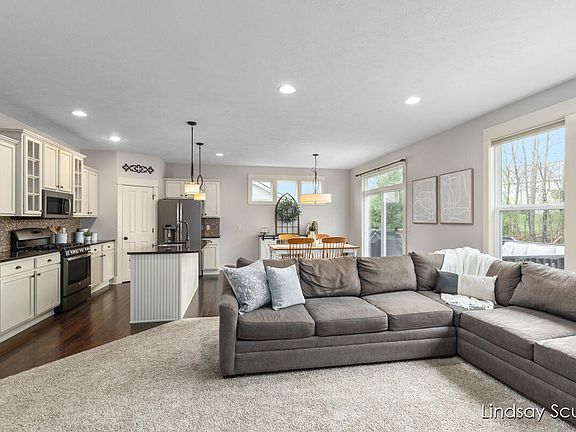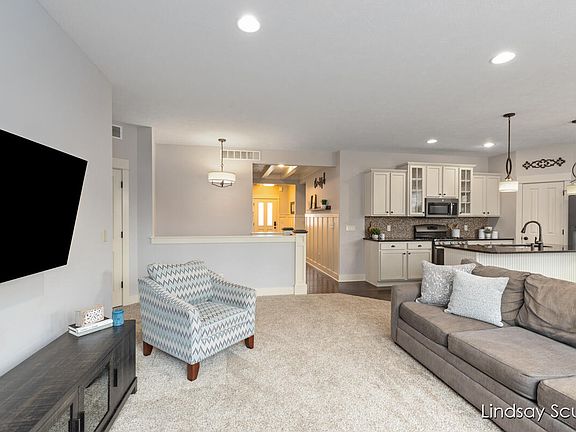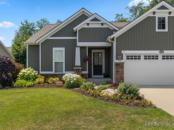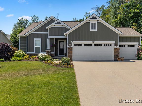 Welcome to your Byron Center dream home located in the vibrant Carlisle crossings community with fantastic amenities, including a pool, clubhouse, tennis, basketball, and pickleball courts, all within walking distance! This light and bright open-concept ranch offers a perfect blend of elegance and comfort, featuring 3 spacious bedrooms on the main floor and 2 full bathrooms, along with an additional bedroom and office in the finished basement. The heart of the home boasts a large center island with an eating area, granite countertops, and a walk-in pantry. The primary ensuite offers a serene retreat with a walk-in closet, double sinks and a glass shower door. Main-floor conveniences include a laundry room and a welcoming entryway adorned with custom board and batten trim and hardwood floors. The mudroom off the 3-stall garage provides extra space for organization and storage. Wander downstairs and you'll find large windows that fill the space with natural light, custom built-ins, and a cozy gas-burning fireplace, perfect for relaxing evenings. Step outside to enjoy a tree lined backyard that backs up to the Kent Trail System, providing direct access to scenic Douglas Walker Park. Don't miss the chance to own this beautiful, nature-connected home that truly has it all!