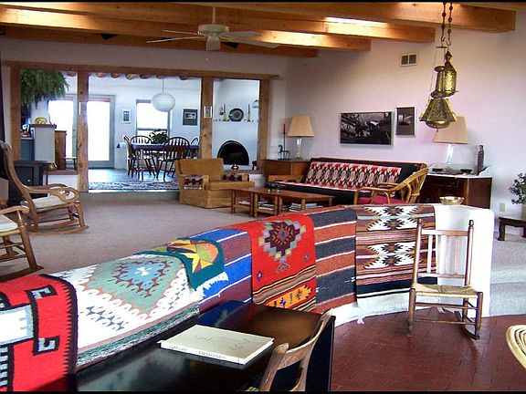 This warm and inviting passive solar, single level home is situated on a 2.5 acre gentle ridgeline that offers outstanding mountain views while maintaining a sense of place and privacy. The open floor plan gives a sense of interior space, and the expansive windows communicate with the views. With both North and South outdoor portals and patios, a new owner will have all day outdoor summer enjoyment of the gardens and views. The interior living areas are spacious and bright and the sunroom is an arc of windows. The kitchen boasts Jemez views, a large pantry and breakfast bar. The large dining area has a kiva fireplace and doors to the portal. A separate office area plus a creative work space off the laundry room add to the livability of this home. Other features include a two-car garage and a small building converted from a stable.