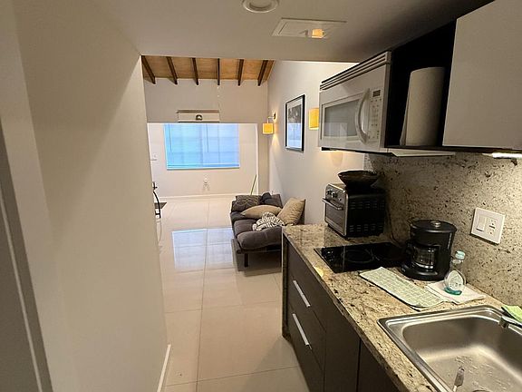 The kitchen is fully equipped with modern appliances refrigerator, microwave, coffee maker, toaster oven, and electric cooktop all with granite countertops.