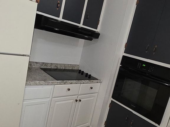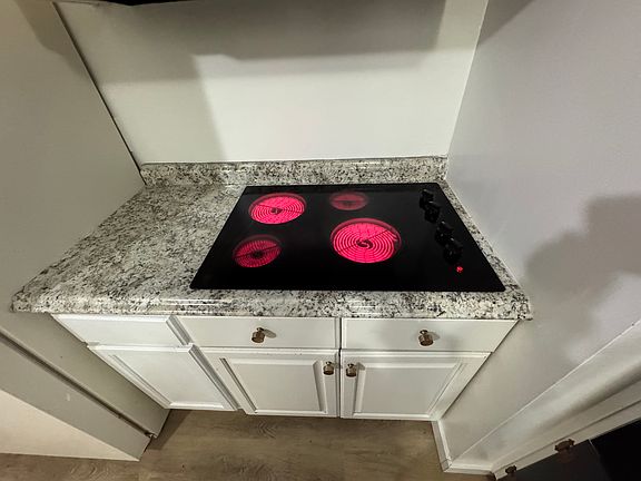 Kitchen features smooth top electric stove top, electric oven, ample cabinets and cupboards.