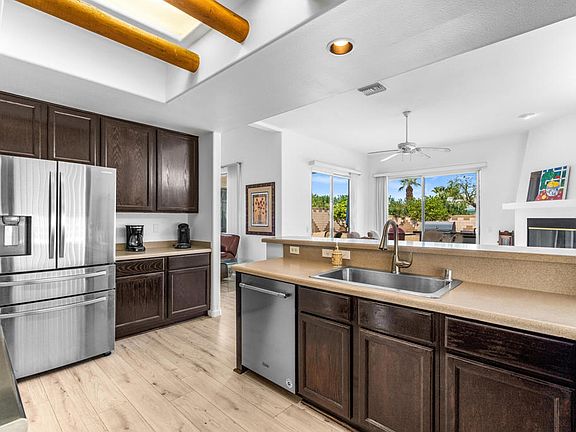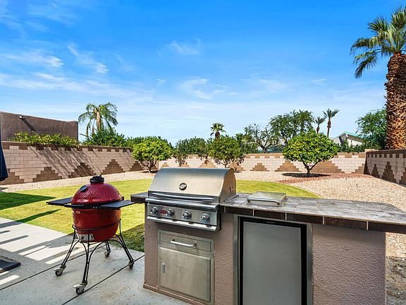 Spacious, private, only ONE owner, and centrally located on a quaint cul de sac, in the sought after and quiet neighborhood of short-term rental friendly- Sedona in Bermuda Dunes. This lovingly maintained 3 bedroom 2149SF home with Huge backyard and attached 2-car garage has been updated with new luxury vinyl wood flooring throughout and new roof, plus upgraded guest bathroom. Inside discover the light filled living room with high ceilings, sliding glass doors, separate office/sitting room, and gourmet kitchen with large walk-in pantry plus open dining area with cozy gas fireplace and breakfast bar. Outside enjoy a generous private backyard with newly tiled built-in BBQ, fruiting citrus trees and a large lawn for entertaining and relaxing. The large en suite primary has dual sliding glass doors for convenient access and abundant natural light. Two additional bedrooms and a generous bathroom are located down the hall. The Sedona neighborhood is STR friendly with an affordable $20 HOA offering a lush greenbelt and expansive sidewalks for morning strolls and sunset walks. Near great schools, shopping and eateries with easy freeway access, this home offers a great investment in a wonderful neighborhood.