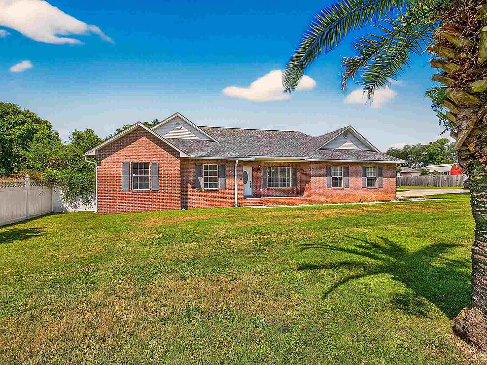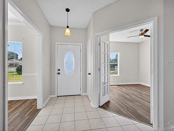 2,102 sq ft all-brick home with split, open floor plan and vaulted ceilings. Three bedrooms plus a flex room with a closet. Primary suite built to impress: tray ceiling, soaking tub, double vanity, dual walk-in closets, and separate shower. Upgrades that matter: Roof, HVAC, and water heater only 5 years old. LVP flooring in main living areas, tile in kitchen, foyer, bathrooms, and laundry. Recessed LED lighting, cozy, easily maintained electric fireplace, hurricane shutters, and a whole-house water filter. Outdoor perks: Fully fenced yard with irrigation, screened porch, and covered front porch. Bonus—this home will NEVER have a direct neighbor. Two-car garage plus shed. Minutes to Navy Federal, I-10, I-110, and Pensacola Fairgrounds.