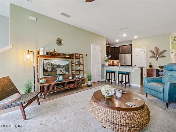 Welcome home to this beautifully upgraded townhome, just 1 mile from Oakleaf Town Center with shopping, dining, and entertainment close by. Inside, enjoy luxury vinyl plank flooring downstairs, 9' ceilings, plantation shutters, and stylish lighting. The powder room features an upgraded vanity for added storage. The kitchen impresses with 41'' espresso cabinets, granite countertops, stainless steel appliances, a custom backsplash, and a pantry. An under-stairs closet adds extra storage with a hanging rack and shoe cabinet. Upstairs, both bedrooms have private en suite baths. The primary suite includes a walk-in closet with custom modular organization. The laundry area—washer and dryer included—is conveniently located between bedrooms. Community amenities include a sparkling pool, playground, and dog parks. Curtains in the living room convey. Don't miss this move-in ready home with modern upgrades in a prime location!