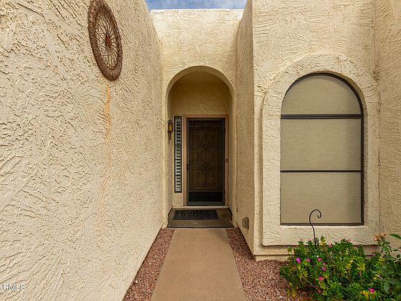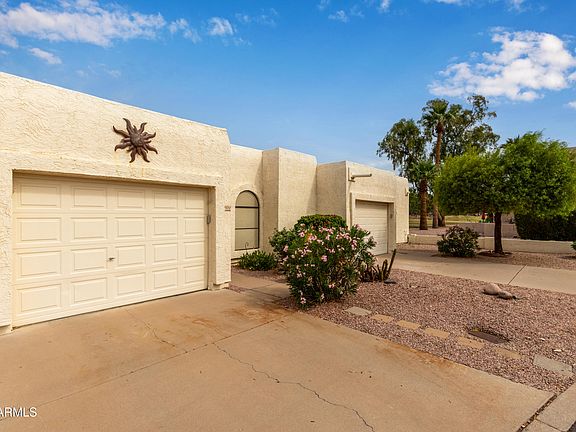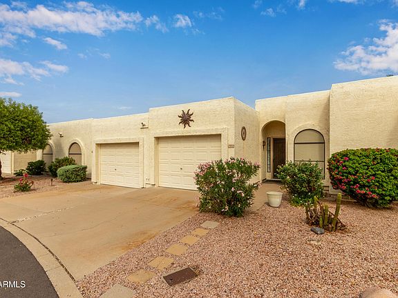 Enjoy the view on your extended patio over-looking the golf course! Move-in ready! Beautiful split 2 bedroom, 1 3/4 bath with a single car garage. New HVAC and Vinyl Plank Flooring in 2022. Fresh paint, granite counter tops in the kitchen, skylight, updated lighting, and ceiling fans. New fridge, washer, and dryer. New blinds. Newer hotwater heater and disposal. Direct access from garage and inside laundry. Active Adult 55+ Gated Community, FOUNTAIN OF THE SUN! Enjoy this Country Club & Golf Community offering lakes, billiards, top of the line golf course, post office, etc. Lots of planned activities, pickleball, yoga, arts & crafts, card room, shuffleboard, etc. Birdie's restaurant opened daily..