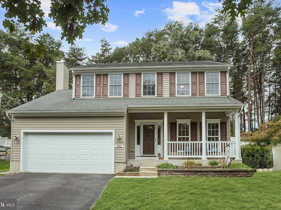 Exceptional home on a quiet cul de sac impresses with spacious interiors, updates throughout, and a convenient commuter location! The welcoming curb appeal with covered front porch sets the tone for what awaits inside including an open floor plan, hardwood flooring, dimmable LED recessed lights, updated light fixtures, ample storage space, and more! Prepare delectable dinners in the kitchen appointed with 42 inch cabinetry, stainless steel appliances including a double oven, granite counters, tile backsplash, center island with seating, pantry, and adjacent breakfast room. Spend quality time with loved ones in the family room off the kitchen around the cozy stone surround wood burning fireplace. The sizable living and dining room combination make entertaining and everyday comfort a breeze. Dedicated laundry room offers new storage shelving. Ascend upstairs to the large primary bedroom highlighting a walk in closet with closet system, and an en suite bath with a double vanity, tiled shower with frameless glass door, linen closet and additional closet. Three additional generously sized bedrooms and a full bath conclude the upper level. The finished lower level provides space for a recreation room, den/study, or media room with a wet bar hook up as well as a full bath and finished bonus room. Additional convenient features throughout include lighted closets, USB charging outlets, and soft close cabinetry in the kitchen and baths. Enjoy the low maintenance composite deck with a retractable awning and a hot tub overlooking the fenced backyard with a storage shed. Commuter routes including I-97, MD-170, MD-32, and MD-100 offer convenient access to BWI Airport, Fort Meade, Columbia, and Baltimore. Property Updates: LED lights, lower level paint, laundry room shelving, French drains, dining room chandelier, pendant lights, AC unit, shed interior, and more!