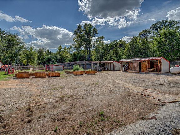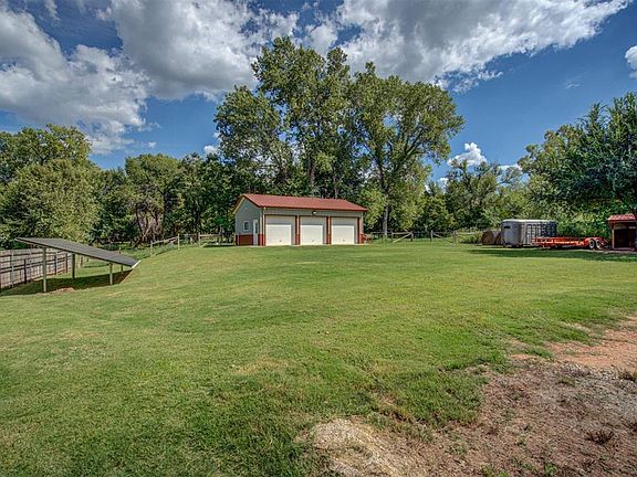 MAJOR PRICE IMPROVEMENT AND SELLERS WILLING TO PAY CLOSING COSTS OR RATE BUYDOWN! MUST SEE! 7+ acres of paradise just E. I-35 Edmond. Stocked pond, mature trees, fire pit, play fort. Wrap around front porch w/ heated pool. 2 fully fenced livestock pastures, 2 large poultry pens and pig pen. Multiple buildings for storage and 2 large shops! Front shop 42x72, fully electric and propane. N. stall is a pull through w/ 14 ft doors on each end, FULL RV hookups, water, 50 amp electric, and sewer w/ 3 more vehicle stalls, workshop area, full W/D hookups, full bath w/ shower, loft area is 42x16 for storage. 2nd shop is 24x32 w/ electric and 3 o/h doors. 3000 sq. ft home remodeled 2018. Kitchen w/ custom cabinetry, high-end appliances, granite countertops, farmhouse copper sink, island with lots of unique pull outs and walk-in pantry. 100% wood look tile flooring = pet friendly! Covered patio, hot tub and built-in bar. Wood burning stove, partial solar backup, 2 water wells, a root cellar and raised garden beds. Storm shelter and irrigation on its own separate well. Fenced w/ welded steel pipe.