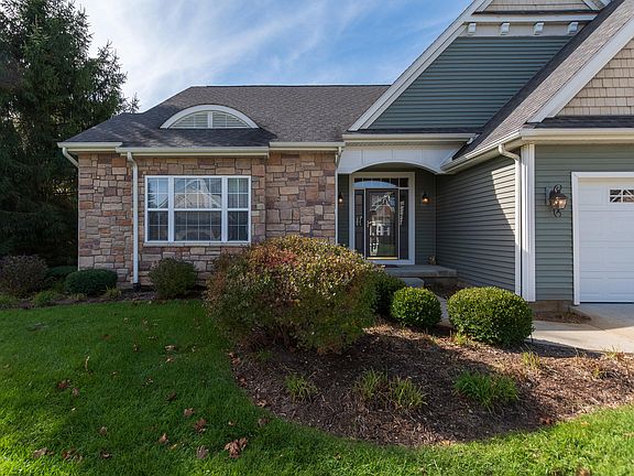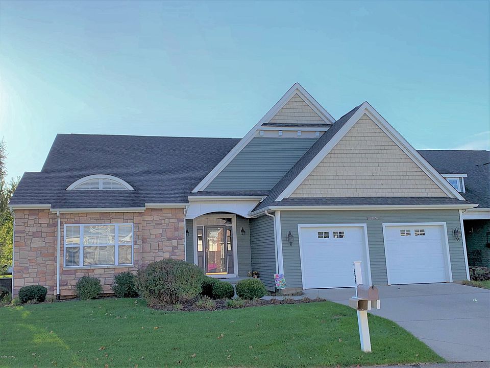 This immaculate condo in Carriage Pointe at Applegate is a former model. Throughout the home you will see all the model updates such as vaulted ceilings over the living, kitchen and dining areas, custom kitchen with 42" cabinets, large island with breakfast bar, beautiful distressed hardwood floors in the kitchen and dining area. The spacious living room boasts a cozy fireplace, and glass doors that lead to the large deck overlooking the tranquil pond. The master suite offers a tray ceiling, walk-in closet and a fabulous bath with soaking tub, stall shower, and an abundance of cabinets. There is also a second bedroom, full bath, and den. The unfinished walkout basement is an opportunity to add another 2,000 sq. ft. of living space. JUST MOVE IN AND ENJOY!