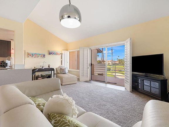 REDUCED. Welcome to this beautifully updated home on a quiet street, offering breathtaking views of the 10th green, fairway, lake, waterfall, and a serene, illuminated fountain at night. The remodeled kitchen is a showstopper, featuring a quartz waterfall countertop, elegant glass tile backsplash, and updated cabinet doors, creating a sleek and modern space. A bar counter adds the perfect touch for entertaining. Designed for both style and comfort, this home boasts newer flooring throughout, with easy-maintenance tile everywhere except the living areas and bedroom. The remodeled bathroom offers marble-like shower tiles, updated water fixtures, and a new toilet for a spa-like experience. Fully furnished with a sleek leather modular couch with a chaise lounge and Samsung TV in both the living room and bedroom, this home is truly move-in ready. Additional features include a newer Carrier heat pump and air conditioner, a premium Samsung full washer and dryer, a partially drywalled garage, and a new garage door opener. With stunning views of the golf course and spectacular sunsets and modern finishes, this home is a rare gem. The complex's amenities include 6 community pools and spa areas provide ample opportunities for relaxation and recreation. The added perk of UNLIMITED golf on a Ted Robinson designed par-3 course. Tennis and pickleball courts, and Helix Disc Golf enhance the lifestyle appeal. Low HOA dues covering essential services, cable, and internet make for worry-free living.
