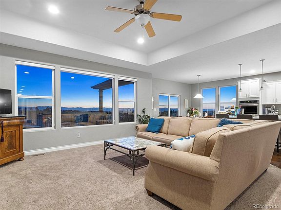 - Description: Huge Windows With Beautiful Mountain Views To Longs Peak And Views Of Downtown Denver; Open To Kitchen And Dining; Beautiful Engineered Wood Floors Throughout, Tray Ceiling With Fan And Recessed Lights; Large Gas Fireplace With Tile Surround And Floating Wood Mantle.