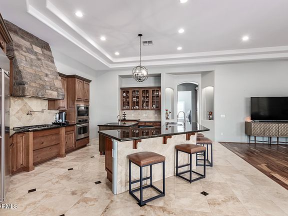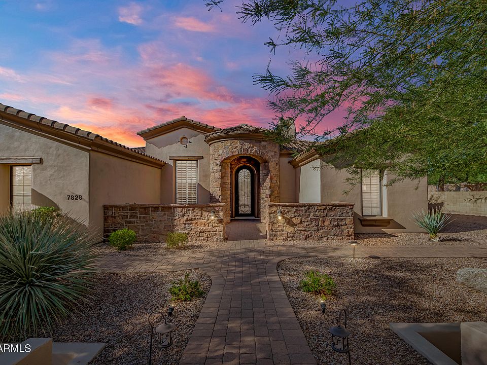 Prepare to be amazed by this beautiful custom home! Hurry and see this 4 bed, 4.5 bath residence now for sale! Nestled on a premium corner lot and featuring a stunning facade w/stone accents, manicured desert landscape, 3 car side garage, paver driveway & walkways, and a gated front courtyard! Inside you will find a spacious dining & living area w/polished stone floors, recessed lighting, plantation shutters, and neutral palette throughout. Continue into the elegant family room, boasting tray ceilings, engineered hard wood floors, and an impressive stone fireplace! The gorgeous chef's kitchen is comprised of wood cabinetry w/crown moulding, a walk-in pantry, granite counters, stylish backsplash, high end stainless steel appliances, an island w/a breakfast bar, and a breakfast nook. Don't forget about the cozy den, perfect for an office! Sit back and relax in the primary bedroom, w/its separate outdoor access, 2-way fireplace, walk-in closet, and lavish ensuite w/dual sinks. Every other bedroom also includes a private bath for added comfort! Finally, the wonderful backyard includes a covered patio, extended seating areas, a built-in BBQ, artificial turf, view fence, and a sparkling blue pool! The home of your dreams is here, act now!