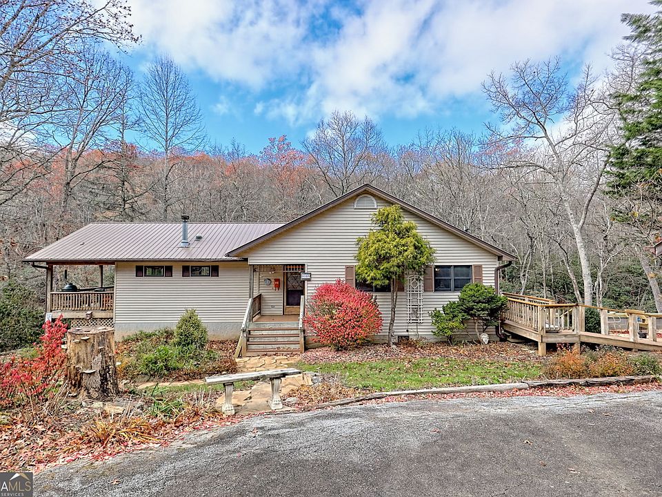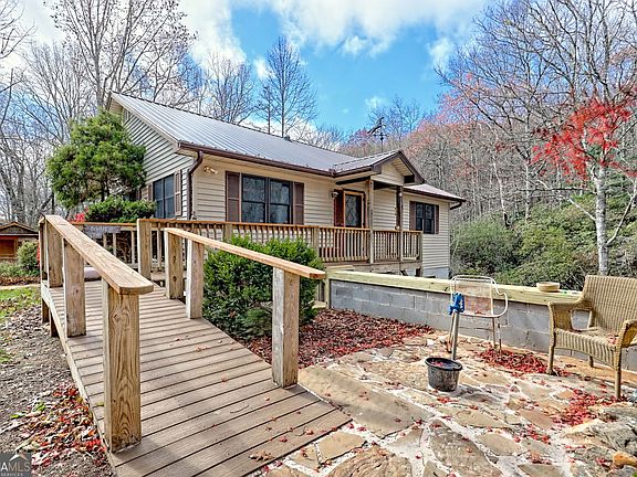 A Wonderful 3-bedroom, 2-bathroom, mountain homeplace overlooking a fast-flowing creek on 5 wooded acres. There are 2 large, covered porches for relaxing Creekside. The living room has beautiful all-wood ceilings; a wood-burning stove with stacked rock wall and rock hearth, and large picture windows to take in the views of the creek. It has a circular driveway with a small carport and a ramp walkway to the side door entrance. There is a full, unfinished basement with a tuck-under garage and a separate driveway. This property has tons of potential. There are picnic areas along the creek, Garden spots, several outbuildings for your chickens, or commercial potential along the road. One of the buildings along the road has a bathroom and used to be an antique store. One of the other buildings used to be an art studio. The property is not in a subdivision, so it may be able to be subdivided with permission from Macon County. This rare find property was built by and has been enjoyed by the same family for several years but is now ready for you to make it yours. Only 10 minutes to Highlands, NC and Sky Valley, GA. Located within a few minutes of several wineries, hiking trails, Ziplining, and Snow Tubing. Shown By Appointment only