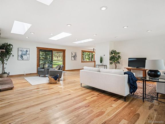 A rare one level property for true main floor living. This 1970’s home was enhanced with a large addition that includes a spacious primary suite, 5 piece primary bathroom, office, exercise area and adjacent laundry room. Four bedrooms with 3.5 bathrooms includes ensuite guest bedroom while the remaining 2 bedrooms have a full bathroom to share. For convenience there are two locations for laundry, one within the primary suite and the other for the remaining guests/family members. Hardwood floors encompass the fireplace sitting area, living room, kitchen and formal dining room. The kitchen features a double oven, cook-top, ample cabinetry, granite countertops, island, and a built-in sideboard in the adjacent eating space. The layout opens to the stone fireplace sitting area that has access to the outdoor patio for easy entertaining. Many windows throughout the home allow the Colorado outdoors to be a part of your everyday living including the sightings of our beloved deer and elk. This property is complete with an oversized two car garage, easy circular driveway, flat useable yard, and paved county-maintained roads. Conveniently located to schools, shopping, DTC and DIA. Zoned SR-2 so you could build an auxiliary unit. New roof 2025 and great producing well.