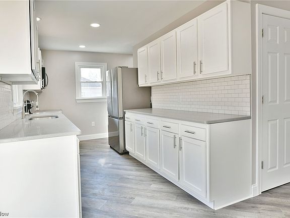 Revel in the tastefully updated living space of this must-see four-bedroom Leavittsburg home! Set off the road in a peaceful, tree-lined setting, this move-in-ready residence awaits with its engaging green exterior and fresh concrete pad that leads into a two-car attached garage with a unique extended bay. A rising sidewalk leads up to the wood trimmed front patio and main entrance where a decorative entry door leads you inside. Here, a sun washed living room wows with its impressive use of natural light thanks to a large picture window. Recessed can lighting aids as it shines down across the ash colored, hardwood styled flooring. The soothing gray and white theme paints an appealing aesthetic as it continues down the main hair and into the nearby combined dining room. Here, sliding doors beckon the expansive rear deck that overlooks the backyard. Slick, stone countertops join a white tiled backsplash and stainless appliances that grace the modern kitchen. Down the hall, an oversized full bath enjoys a splash of color along with an articulately tiled shower and backlit vanity. Four carpeted bedrooms increase in size to finish with a rearward master suite, complete with its own bespoke private bath with more yet elaborate tile work, shiplap trim and a rainwater shower. At the basement level, a fireplace laden family room accompanies both adjacent half bath and laundry services along with an additional bonus room.