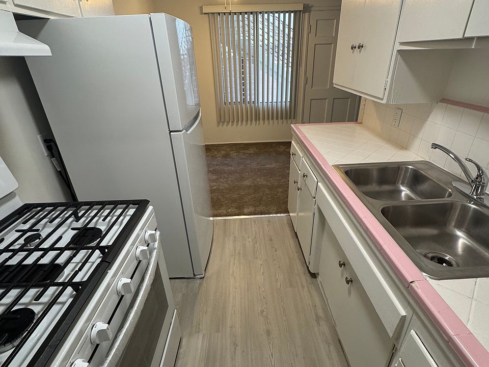 This quite spacious downstairs 587sq ft apartment is completely refurbished new carpet, flooring and vertical blinds. New paint entire apartment. New stove and refrigerator New ceiling fans in the dining room and the bedroom.