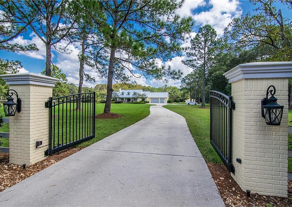 Amazing 5+ acre retreat! The gated entrance grants access to this sprawling estate. The long winding driveway leads to the gorgeous ranch style home with bonus room and 3 car garage; and also to the detached oversized 2 car garage which would be perfect as a barn for this equestrian property. The welcoming front porch and wood double doors set the tone and lead you inside to hand scraped wood floors on the first floor, custom built-ins and crown molding throughout. The formal living room with a wood burning fireplace is directly across from the formal dining room complete with a built-in granite buffet with wine refrigerator. This opens to the gourmet kitchen with wood cabinets, granite countertops and high end appliances including a double oven. The spacious family room has two sets of french doors that lead to the gorgeous screened in lanai with heated, salt water pool and spa. A guest bedroom and ensuite bathroom are on one side of the home near the laundry and garage. While the remaining bedrooms are located privately on the other side including the master suite with granite top dual vanity, steam shower, walk-in closet and access to the lanai. On the second floor the bonus room would make a great game room or home theater. A full bathroom and an office/optional bedroom round out this space. Convenient location offers plenty of privacy yet quick easy access to major roadways and shopping. Park like in size and beauty, this is truly a wonderful property.