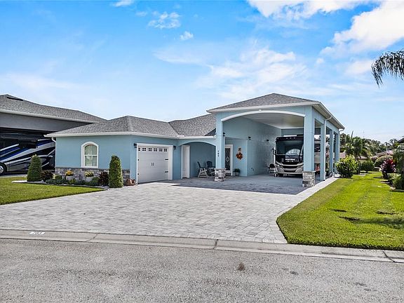 We are pleased to present an exceptional opportunity to acquire a recently constructed, move-in-ready residence within the highly desirable community of Mt. Olive Shores North. Built in 2022, this property offers the perfect winter haven for RV enthusiasts. This cozy home, encompassing just over 1,300 square feet, boasts an intelligently designed open floor plan, ideal for effortless entertaining. The residence features one bedroom and one and a half bathrooms, expertly configured to maximize space and functionality. A significant highlight of this property is the expansive RV port, measuring approximately 56 feet in length and 20 feet in width. This substantial space comfortably accommodates a large RV, along with a golf cart or additional vehicle as needed. A 1.5 car garage provides secure storage, easily accommodating a golf cart and offering convenient access to extra storage, a water softener, and a utility sink. The interior of the home is adorned with modern, neutral finishes, creating a bright and inviting atmosphere. The screened lanai is perfect for relaxing and enjoying the view. Given the exceptional features and prime location, we anticipate considerable interest in this property. We encourage you to contact us at your earliest convenience to schedule an appointment for a private viewing. This opportunity will not last long.