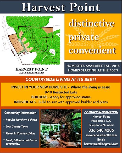 COMING SOON - HARVEST POINT! A distinctive, private, and convenient picturesque oasis in popular Northern Guilford County! Tucked just off Hwy 150 E. Harvest Point is a quiet and charming residential enclave of 8 to 10 unique and restricted home sites. The small community is located only minutes from the popular Northern Elementary, Middle, and High Schools, and has access to a variety of shopping, restaurants, and other convenient services. Harvest Point features a variety of outstanding home sites - large secluded lots with hardwood trees, and a creek that meanders through part of the property - complete privacy in a rolling, wooded setting and beautiful spacious lots ready to build on the quiet cul-de-sac. Lots vary in size and price. HARVEST POINT IS AT THE INTERSECTION OF PAST AND FUTURE - A CAREFULLY PRESERVED COUNTRYSIDE SANCTUARY WITH MODERN CONVENIENCES FOR DISCRIMINATING HOME BUYERS.
