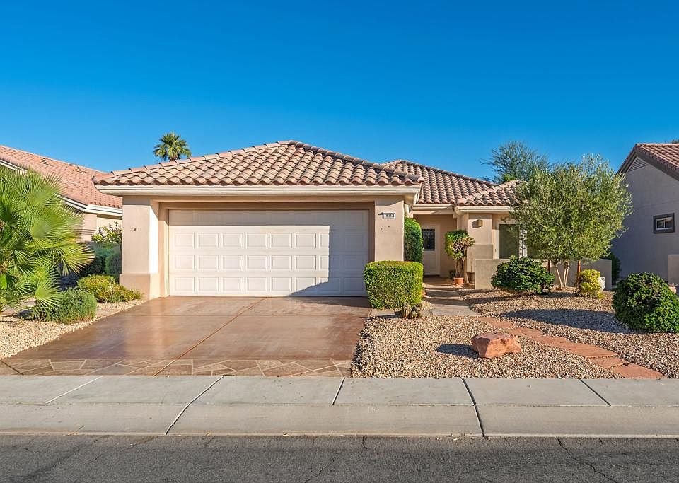 Sun City Palm Desert - Gorham. Ideally located just a short distance from both the Mountain View and Sunset View Clubhouses, this charming home offers comfort, style, and convenience. The north-facing rear yard features a spacious covered patio surrounded by lush desert landscaping--perfect for outdoor relaxation. Curb appeal abounds with a decorative concrete driveway, front courtyard, and coordinated hardscape. Inside, diagonally laid tile flooring extends throughout the main living areas, with shutters on most windows. The kitchen and dining area feature vaulted ceilings, adding to the home's open and airy feel. The kitchen includes Corian countertops, a breakfast bar, and a skylight for natural light. The dining area has a bay window and a slider leading to the rear patio. The primary suite includes two closets with mirrored wardrobe doors, a vaulted ceiling, and direct access to the covered patio. Its en suite bathroom offers dual sinks, a stall shower, and a Solatube for added light. The guest bedroom has its own slider to the front courtyard and is adjacent to a full bath with a tub/shower combination. Additional features include an interior laundry room and a two-car garage with its own air conditioning and abundant storage space. The home's main HVAC system was replaced in 2019.