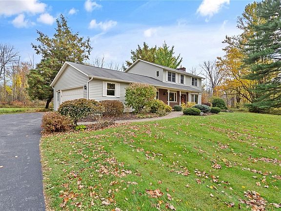 This stunning four-bedroom Colonial sits gracefully on 2.75 acres of private, tree-lined land, offering the perfect combination of timeless charm & appeal. Surrounded by natural beauty and peaceful seclusion, the home welcomes you with classic curb appeal. Step inside an open foyer and be wowed by the magnificent Great Room featuring gorgeous hardwood flooring that flows seamlessly creating a warm & inviting space.The extraordinary kitchen is a true centerpiece — thoughtfully designed with granite countertops, stainless steel appliances, recessed lighting and soft close cabinetry. Plenty of seating at the raised breakfast bar to sip on your morning coffee or tea! This sun drenched room features a dining area, sitting room & boasts two sliders one leading to the fabulous back yard. On the other side of the home you'll find a massive living room featuring formal dining, a wood burning fireplace & two more big beautiful sliding doors to gaze out into the backyard retreat. Upstairs, you'll find four generously sized bedrooms and two full bathrooms ready for you to add your personal flair. Convenient first floor laundry is a bonus! Step outside, and you’re greeted by your own private retreat — Huge rolling lawn, mature trees and garden space, ideal for outdoor gatherings or quiet relaxation. A trickling pond adds to the sense of serenity, filling the air with the soft sound of flowing water. You'll see some bright colored fish swirling around! Create your own personal space on the cozy deck overlooking this wonderful back yard haven. A brand-new roof offering peace of mind and years of worry-free living is being installed this week! This sparkling clean home is truly move-in ready and waiting for its new owners to create their own story in the coming years ahead. Gorgeous setting in a desirable location close to highways, shopping & a short drive into the Village of Baldwinsville.