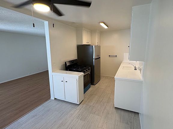 Private front patio spaceDining nookNew appliancesStainless steel refrigeratorOpen parking spotWall heaterCeiling fans
