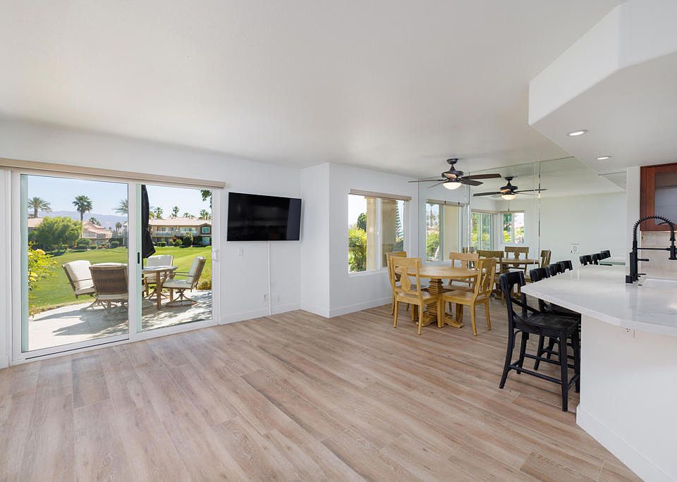 Welcome to this beautifully updated 2 bedroom, 2 bathroom condominium located in the gorgeous golf course country club of Palm Royale. Step inside and be greeted by the high-quality finishes throughout. The open-concept living area offers a spacious and inviting atmosphere, perfect for entertaining guests or simply relaxing after a long day. The kitchen boasts a bright and airy feel with granite countertops, ample storage space. The primary bedroom is generously sized and features a large closet. The bathrooms have been tastefully renovated for a luxurious feel with contemporary design elements. One of the highlights of this condo is the one car detached garage, providing secure parking and additional built-in storage. Whether you prefer to take a stroll through the lush greenery of the country club or enjoy the absolutely gorgeous views of the chocolate mountains from the patio, this condo offers a serene and peaceful lifestyle. Located in a sought-after community, offering UNLIMITED GOLF on a challenging par 3 course designed by Ted Robinson, tennis & pickleball courts, 6 swimming pools and a dog park. With its prime location in close proximity to the club house and it's amenities, this condo is perfect for those who appreciate an active and leisurely lifestyle. This stunning condominium is available for long-term offering you the opportunity to make it your home. Don't miss out on the chance to experience luxury living in the heart of La Quinta!