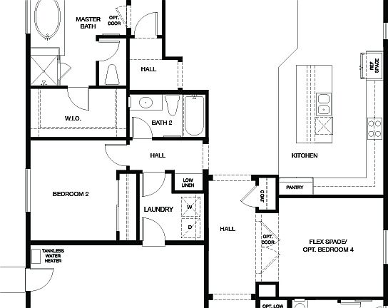 The single-story Ryder features 4 beds, 3 baths and 2,204 sq. ft. With options to personalize the home to fit your needs, the Plan 2 features a 3rd bedroom at the front of the house. A flex space sits in between bedroom 3 and the kitchen. The open concept living room overlooks the dining nook and functional kitchen with working center island. The master suite overlooks the backyard and offers a dual vanity, soaking tub and walk-in closet. An additional bedroom, bathroom and laundry room round out the home. Time to choose all interior options! Come visit us today!