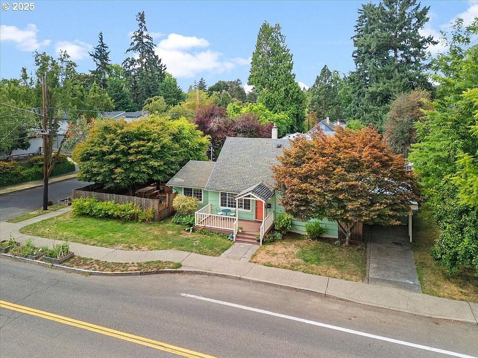 Step into a truly special home bursting with charm, character, and an abundance of natural light. Nestled on a beautifully landscaped, fenced corner lot, this 4-bedroom, 1.5-bath vintage gem is filled with sunshine, soul, and smart updates throughout. Step into a cheerful living room where sunlight streams through large picture-framed windows, bouncing off warm beech hardwood floors and highlighting the vintage knotty pine paneling. High ceilings and newer paint make the space feel open, airy, and welcoming. The dining room is just as delightful, glowing with light from three windows and a glass door that opens to the side yard. With updated lighting, a charming picture-framed ceiling, and beautiful hardwoods, it's the perfect place for cozy meals or joyful gatherings. The kitchen shines with personality and function: a garden window lets in even more sunshine, while updated appliances (Frigidaire fridge, LG dishwasher, and GE oven), a decorative backsplash, and plentiful cabinetry make everyday cooking feel like a treat. Fresh paint and new hardware keep it feeling crisp and clean. Two bright main-floor bedrooms feature beech hardwood floors, newer windows, fresh paint, and one with custom wainscoting. The main bath has been thoughtfull updated with slate tile flooring, a cast-iron tub, a dual-flush toilet, and modern fixtures.Upstairs, the spacious primary bedroom features a large picture window with treetop and garden views, wall-to-wall carpet, and a charming half bath with newer flooring, fixtures, and wainscoting. A fourth bedroom includes built-ins, a newer Hunter ceiling fan, and lots of natural light. The sunny yard is a gardener’s dream—brimming with blueberries, huckleberries, rhubarb, tomatoes, and fruit trees. Enjoy raised beds, a newer patio (2025), BBQ pad, compost bins, storage shed with power, and a carport.With newer Hardiplank siding upper level, newer cedar shake backside lower portion of the home, and newer window casings south side of the home.