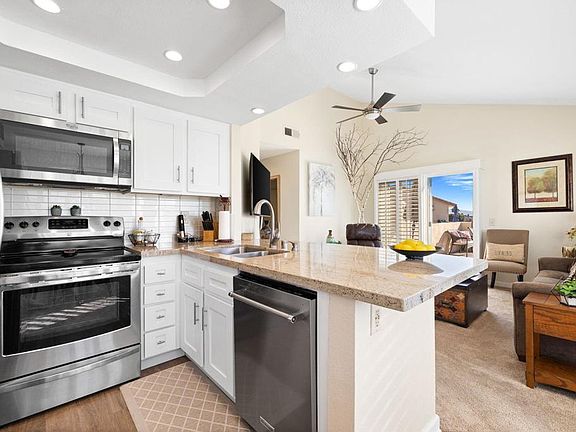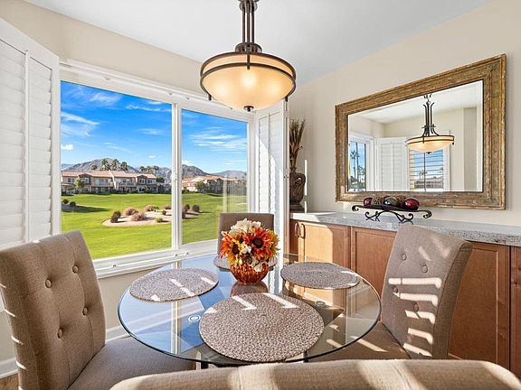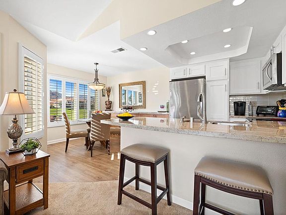 This upper-level view property is in a premium location with views in every direction. The balcony offers breathtaking views of fairways, lakes and mountain ranges. The interior features a great room floor plan with vaulted ceilings. The highly upgraded kitchen features custom cabinetry, granite counters, custom tile backsplash and newer stainless appliances. The kitchen is open to the living area. Both baths have been extensively upgraded with custom tile enclosures, newer cabinetry and granite counters. The guest bedroom is versatile and features office furnishings. This condo features luxury vinyl planking in the dine area. Decorated in warm neutral colors this property is offered furnished per inventory. With energy-efficient vinyl doors and windows the property combines luxury with sustainability. A newer HVAC system was installed in 2025, and ceiling fans and shutters enhance efficiency. New water heater in 2025. The inclusion of a 1-car garage adds practicality to the package. The complex's amenities include 6 community pools and spa areas, to provide ample opportunities for relaxation and recreation. The added perk of UNLIMITED golf on a Ted Robinson designed par 3 course. Featuring tennis and pickleball courts that are well maintained. Now the area headquarters for Helix Disc Golf, enhances lifestyle appeal. Low HOA dues covering essential services, cable, and internet make for worry-free living, while convenient access to shopping, dining, and transportation adds to the property's allure. Situated across from the Indian Wells Tennis Gardens, home of the Paribas Open, this property is perfect for either full-time residence or a luxury seasonal home. Overall, it truly offers a lifestyle of convenience and luxury, appealing to those seeking the ultimate in comfort and relaxation.